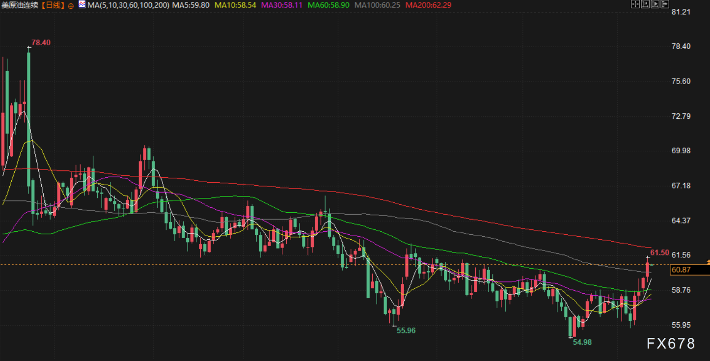 布伦特原油上涨2.5%,结算价报每桶65.47美元;美原油上涨约2.8%,结算价报每桶61.15美元。盘中油价一度上涨超过3%,触及三个月来的最高水平。