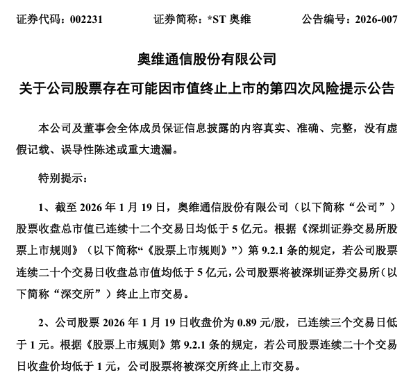 当晚,*ST奥维发布关于公司股票存在可能因市值终止上市的第四次风险提示公告。公告称,截至2026年1月19日,公司股票收盘总市值已连续12个交易日均低于5亿元。根据《深圳证券交易所股票上市规则》(简称《股票上市规则》)第9.2.1条的规定,若公司股票连续20个交易日收盘总市值均低于5亿元,公司股票将被深圳证券交易所(简称“深交所”)终止上市交易。