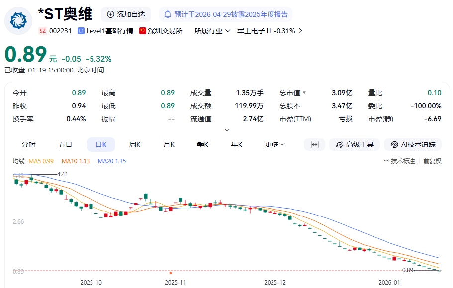 1月19日,*ST奥维(002231)再度跌停,截至收盘,该股报收0.89元/股,总市值为3.09亿元,已连续12个交易日低于5亿元。据此计算,即使未来8个交易日每日涨停,其总市值也难以回升至5亿元,提前锁定市值退市。