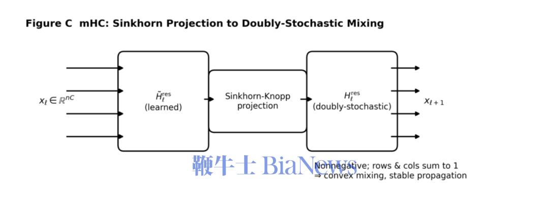 你可以修立交桥、修多车道;但负责“指挥交通”的矩阵,必须服从一套严格的守恒规则。他们选择的规则是:把残差约束到所谓 双随机(doubly stochastic / bistochastic)矩阵集合上——元素非负、每一行和每一列都等于 1(归一化)。