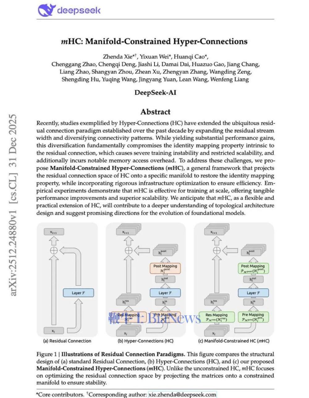 新年第一天,DeepSeek在arXiv放出一篇相当“硬核”的论文:mHC: Manifold-Constrained Hyper-Connections,时间戳是2025 年 12 月 31 日(v1)。