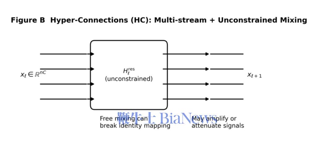 mHC 论文直说了:HC 的这种无约束设计在大规模训练时会破坏 identity mapping 作为“conservation mechanism(守恒机制)”的角色,导致平均信号强度无法保持,从而出现无界放大或衰减。